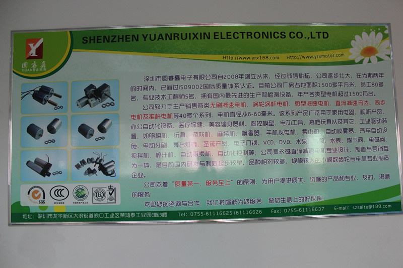 深圳市圓睿鑫電子有限公司自2008年創(chuàng)立以來,經(jīng)過誠信耕耘,在為期兩年的時間內(nèi),已通過ISO9001:2000國際質(zhì)量體系認證。公司廠房占地面積2000多平方米,員工100人,專業(yè)技術工程師6名,擁有國內(nèi)最先進的生產(chǎn)和檢測設備,年產(chǎn)各類減速電機超過2~300萬臺。因公司發(fā)展需要,于2020年底,將生產(chǎn)基地遷往擁有最美小鎮(zhèn)之稱的東莞市清溪鎮(zhèn),依山傍水,依托美麗的大自然環(huán)境和地方文化,全新的東莞市圓睿鑫電子有限公司將借助深圳母公司平臺,一步步走上新的臺階。 東莞公司將繼續(xù)致力于生產(chǎn)銷售各類無刷減速電機 渦輪渦桿電機,微型減速電機,直流減速馬達,交流手搖發(fā)電機、同步電機及空心杯電機等,電機直徑從6-60毫米為定位,系列產(chǎn)品廣泛用于智能家電、智能辦公自動化設備、智能醫(yī)療、美容健身器材、遙控模型、電動工具、高檔玩具以及其它工業(yè)驅(qū)動裝置,如高檔玩具、游戲機、麻將機、飄香器、手機發(fā)電機、柔巾機、自動噴霧器、汽車自動設施、電動牙刷、舞臺燈飾、圣誕產(chǎn)品、智能電子門鎖、VCD、DVD、水泵、氣泵、水表、煤氣閥、電磁閥、攪拌機、榨汁...